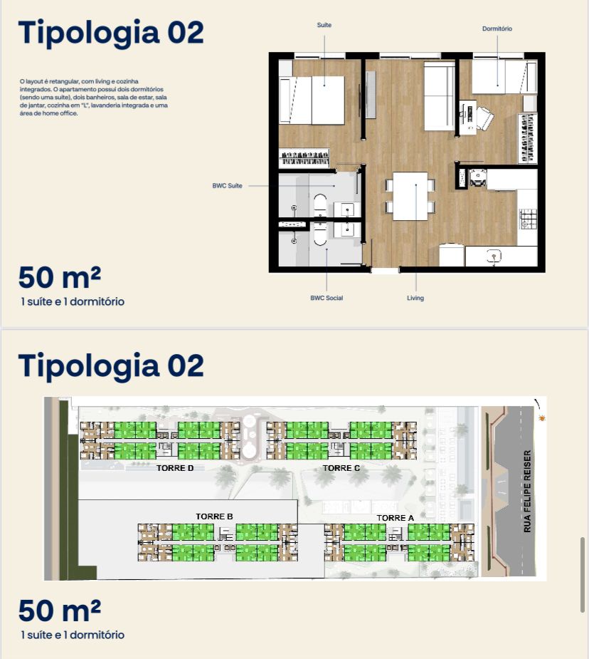 Apartamento Tipo2 dormitórios Planta2 Dorms.1 Suítes1 Vagas50m² ÁreaR$ 520.000 A partir deApartamento Tipo2 dormitórios Planta2 Dorms.1 Suítes1 Vagas50m² ÁreaR$ 520.000 A partir de |
